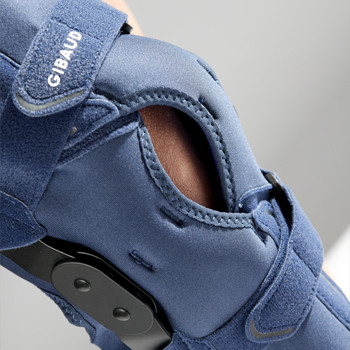 Ginocchiera con apertura anteriore per facilitare il posizionamento e l’adattamento. Stecche con articolazione policentrica per limitare la traslazione antero-posteriore del ginocchio. Blocco a 0° anti iperestensione. Steccaggio rimovibile laterale rigido per garantire la stabilità laterale. Tessuto tridimensionale aerato, leggero, traspirante e confortevole. Due cinghie anteriori e due posteriori regolabili a chiusura contrapposta. Finestra rotulea con due cuscinetti di centraggio semilunari. Apertura in corrispondenza del cavo popliteo (parte posteriore del ginocchio) per facilitare la flessione. Interno con inserti laterali in silicone antiscivolo.